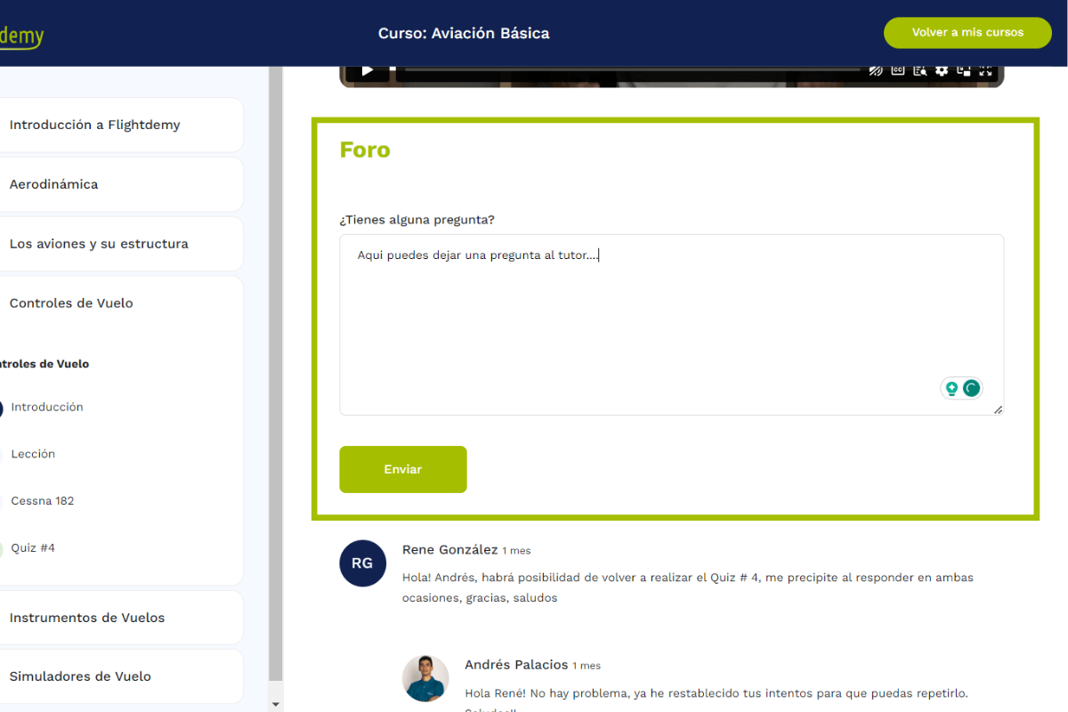 En Flightdemy, valoramos tu éxito y estamos comprometidos con tu aprendizaje. Nuestros tutores están disponibles para brindarte orientación personalizada y apoyo académico. Aprovecha la oportunidad de interactuar con ellos a través del foro de discusión y optimiza tu experiencia educativa.
